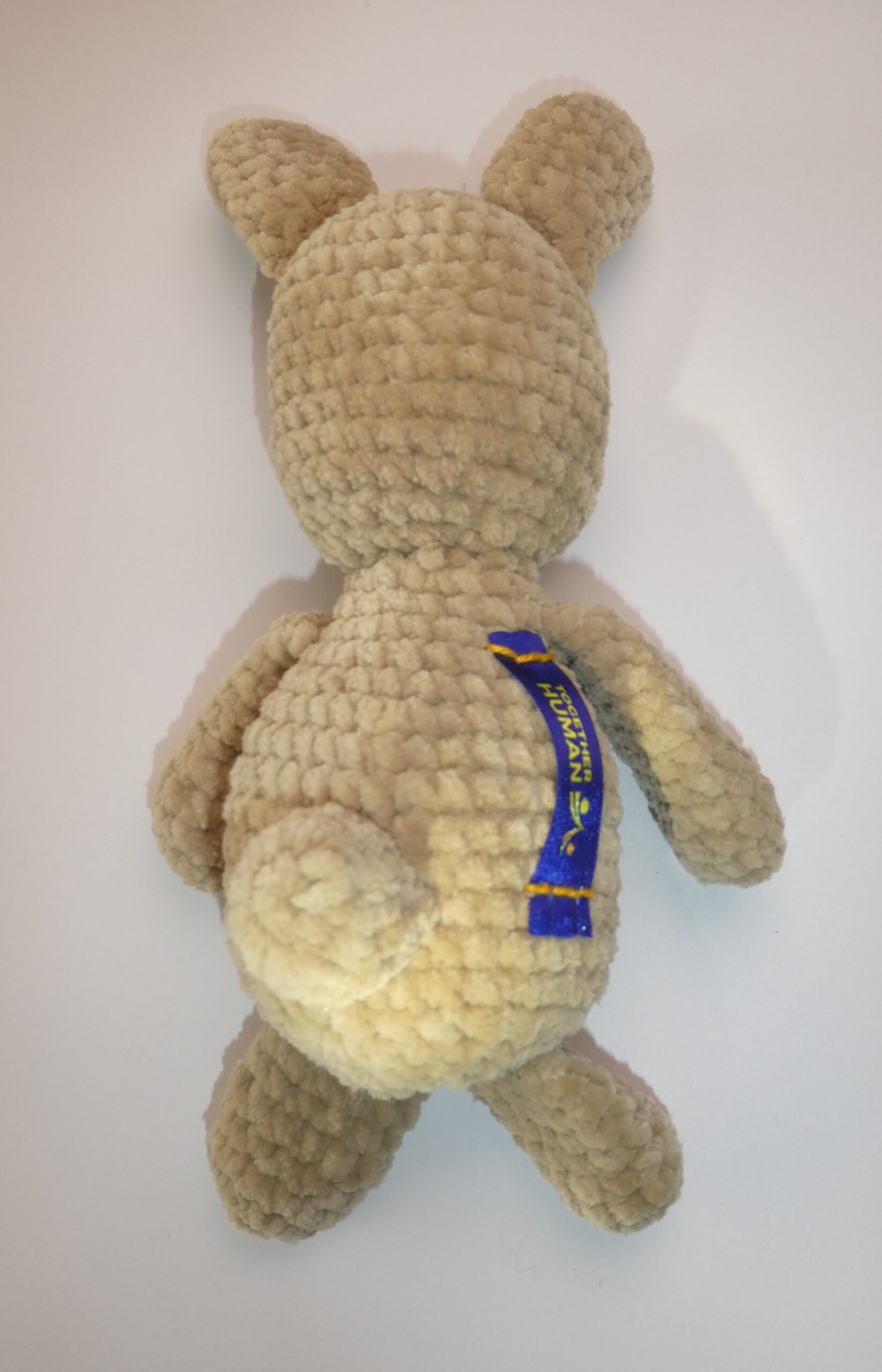 Hans ist aus weichem Garn mit viel Liebe handgearbeitet und mit angenähten Knopfaugen. Körperlänge: 21 cm.